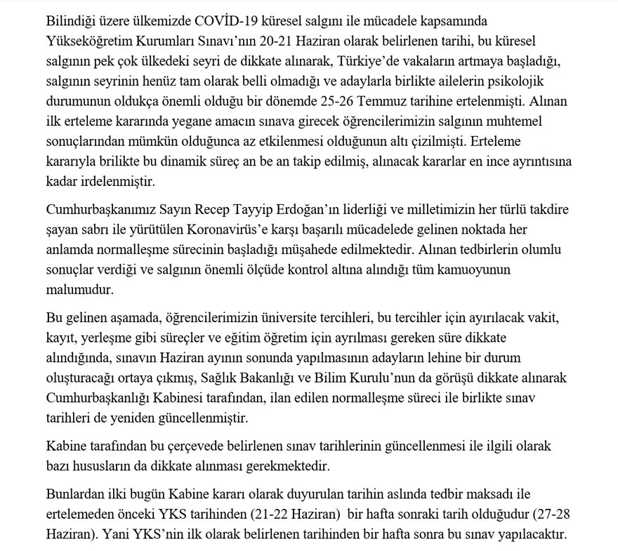 Açıklama yÖk Başkanı Prof. Dr. M. A. Yekta Saraç’tan geldi. Sosyal medya hesabından açıklama yapan Saraç, “2020-YKS’ye yönelik sadece bu seneye özel olmak üzere öğrencilerimizi sevindirecek güzel haberlerimiz var” ifadelerini kullandı.