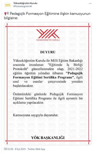 Açıklamada, "Önümüzdeki günlerde Pedagojik Formasyon Eğitimi Sertifika Programı ile ilgili ayrıntılı bir açıklama yapılacaktır" ifadelerine yer verildi