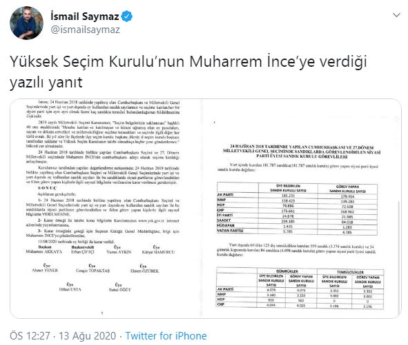 Gazeteci İsmail Saymaz sosyal medyadan yaptığı açıklamada Muharrem İnce'ye YSK tarafından verilen yanıtı paylaştı.