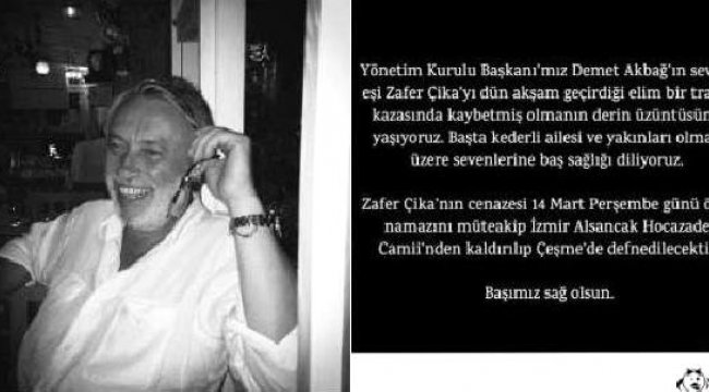 İZMİR'in Narlıdere ilçesinde, bulunduğu pikap tipi kamyonetin şarampole yuvarlanması sonucu hayatını kaybeden ünlü sinema ve tiyatro sanatçısı Demet Akbağ'ın eşi Zafer Çika'nın (51) otopsi işlemleri tamamlandı.