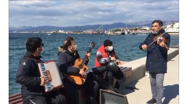 İzmir'in Dikili ilçesinde, çeşitli restoran ve eğlence mekanlarında canlı müzik yaparak evini geçindiren ve pandemi nedeniyle zor günler geçiren müzisyenler, bir araya gelerek açık alanda müzik yapmaya karar verdi.
